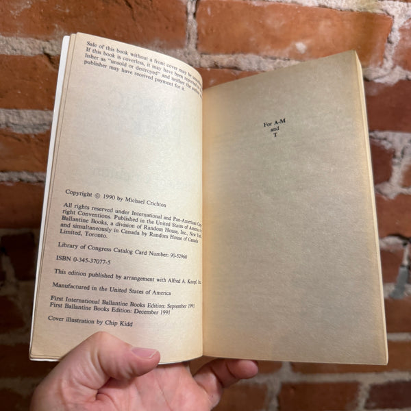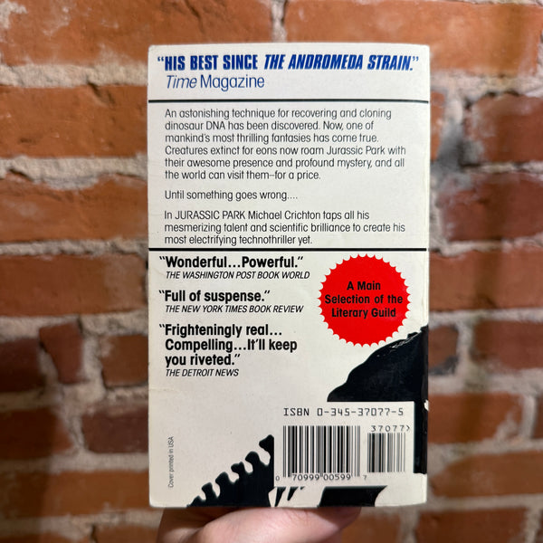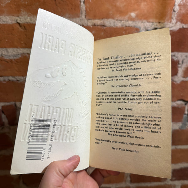 Blurb: "An astonishing technique for recovering and cloning dinosaur DNA has been discovered. Now humankind's most thrilling fantasies have come true. Creatures extinct for eons roam Jurassic Park with their awesome presence and profound mystery, and all the world can visit them--for a price.