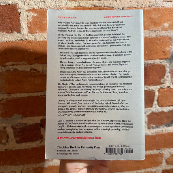In The Masks of War Carl H. Builder asks what motives lie behind the puzzling and often contradictory behavior of America's military forces. The answer, he finds, has little to do with what party controls the White House or who writes the budget. Far more powerful—-and glacially resistant to change—are the entrenched institutions and distinct "personalities" of the three armed services themselves: