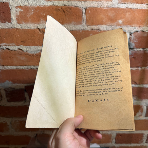 Three survivors, Steve Culver, Alex Dealey, and a young woman called Kate, cling together and explore the vast subterranean tun-nel, only to discover it swarming with bloodthirsty rats that thrive on radiation-that breed, evolve, grow stronger and more intelligent each day, and wait for the chance to wipe out their human enemy. The survivors are in terror. And as they desperately seek exit from the darkness, they get a haunting look into the future where man may have to battle beast for ultimate supremacy....”