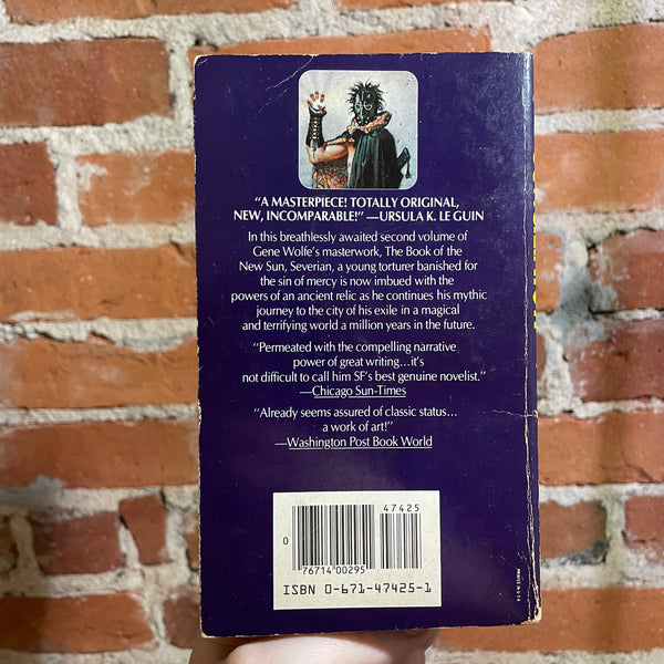 Blurb: "The second volume of "The Book of the New Sun". The torturer Severian continues his journey of exile to the city Thrax, carrying with him the ancient executioner's sword and the Claw of the Conciliator, a gem of extraterrestrial power and beauty which no one man is meant to possess.