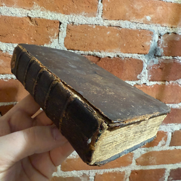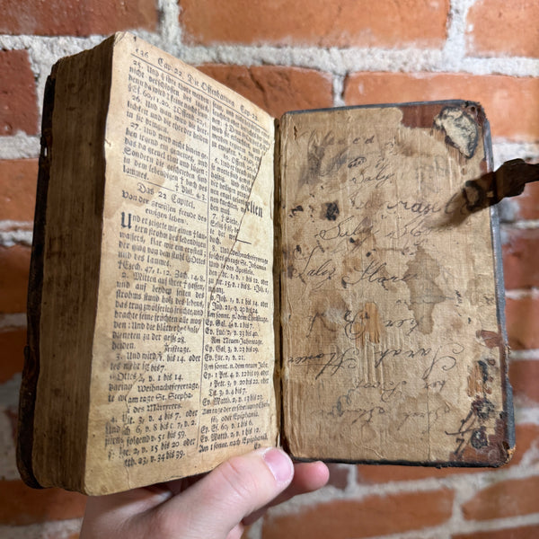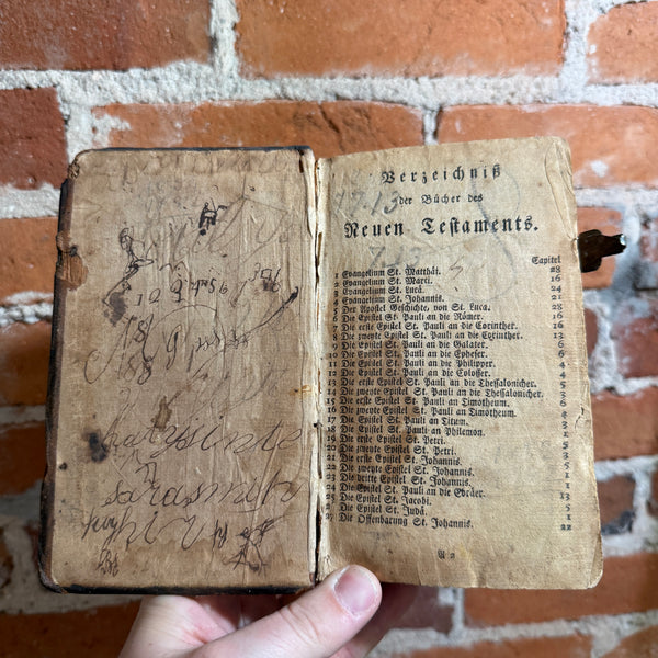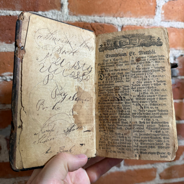 Blurb: “Compact antique German New Testament featuring Evangelium St. Matthäus, printed in Gothic script and bound in original leather with clasp remnants. Heavily worn from centuries of use, with extensive period handwriting, owner inscriptions, and notes throughout the flyleaves and margins. The text block remains intact despite notable wear, soft boards, spine loss, and age-toned pages. A remarkable survivor that reflects deep personal devotion and everyday use.
