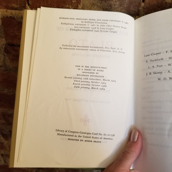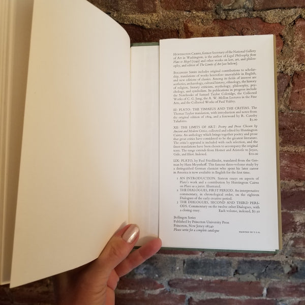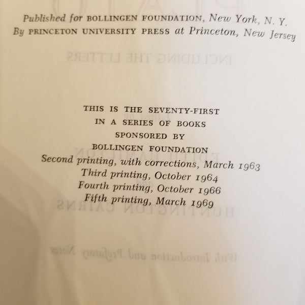 Blurb: Bollingen Series LXXI .All the writings of Plato generally considered to be authentic are here presented in the only complete one-volume Plato available in English. The editors set out to choose the contents of this collected edition from the work of the best British and American translators of the last 100 years, ranging from Jowett (1871) to scholars of the present day. The volume contains prefatory notes to each dialogue, by Edith Hamilton; an introductory essay on Plato's philosophy and writings, by Huntington Cairns; and a comprehensive index which seeks, by means of cross references, to assist the reader with the philosophical vocabulary of the different translators.