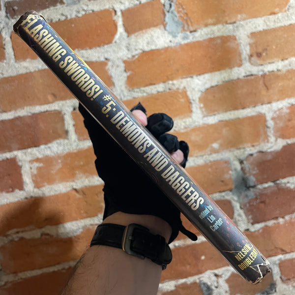 Blurb: “FLASHING SWORDS: DEMONS AND DAGGERS - Edited by Lin Carter - Here are tales of sinister sorcerers and wizards, eerie ritual sacrifice and dank dungeons that trap dashing adven-turers. Here are royal intrigue, mad kings, and the machinations of evil lords.