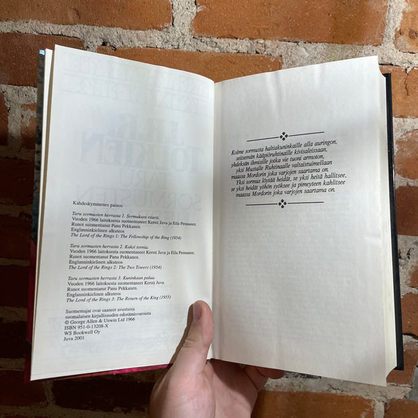 Condition: Acceptable: Acceptable condition for a used book! There is an indent in the back board. We tried to highlight it in the images. See images for the condition of this 20 year old Finnish language edition. This is an amazing addition to any Tolkien collection.