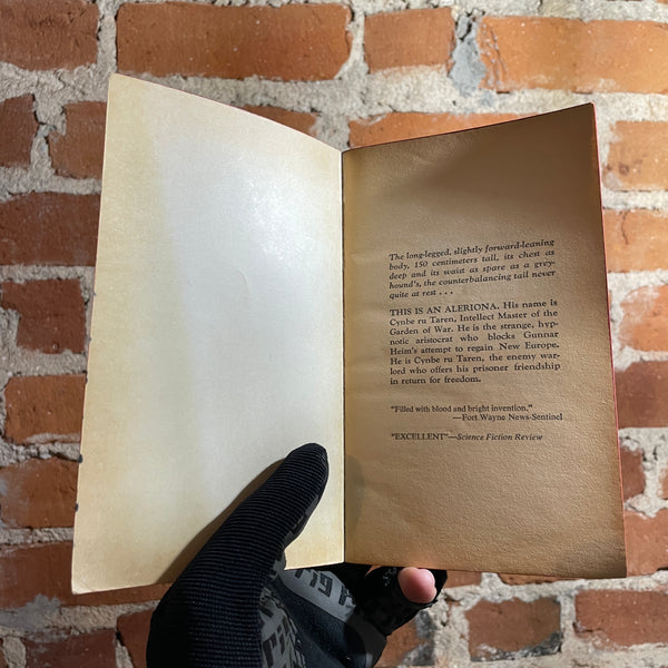 Blurb: "No one will believe the truth about the ingenious plot of the Aleriona people to claim title to the almost untouched planet - New Europe. Only Gunnar Heim dares risk his life and interplantary peace to set New Europe free from control of these strange and alien beings. A space-age patriot carves a civilization of the future in a strange new world haunted by surrealistic citizens, walking forests, slaughter machines...and the memories of lost love.