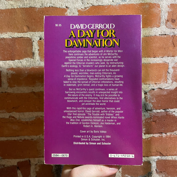 Nothing less than a blowtorch can kill the thousand-pound, wormlike, man-eating Chtorrans. As A Day for Damnation begins, McCarthy fights a growing sense of impotence. Repeated confrontations have failed to stop the spread of Chtorran infestations, resulting in stalemate, grim retreat, and a tragic loss of human life.