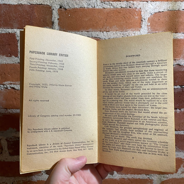 Blurb: "Earth is destroyed in a collision with the rogue planet Bronson Alpha, with about a year of warning enabling a small group of survivors to build a spacecraft and escape to the rogue planet's moon, Bronson Beta. Filmed, with major changes to the story, as When Worlds Collide (1951).