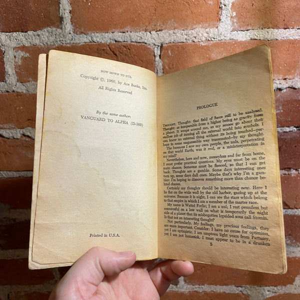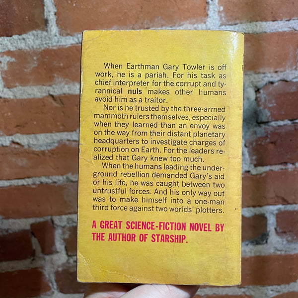 Blurb: “When Earthman Gary Towler is off work, he is a pariah. For his task as chief interpretor for the corrupt and tyrannical nuls makes other humans avoid him as a traitor. Nor is he trusted by the three-armed mammoth rulers themselves, especially when they learned that an envoy was on the way fromtheir distant planetary headquarters to investigate charges of corruption on Earth. For the leaders realized that Gary knew too much. When the humans leading the underground rebellion demanded Gary's aid or his life, he was caught between two untrustful forces. And his only way out was to make himself into a one-man third force against two worlds' plotters.“