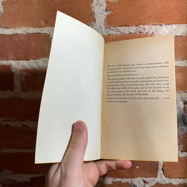 The forest people took him in and raised him almost as a child, teaching him to speak, training him in forest lore, giving him all the knowledge they had. But they could not solve the riddle of his past, and at last he had to set out on a perilous quest to Es Toch, the City of the Shining, the Liars of Earth, the Enemy of Mankind.