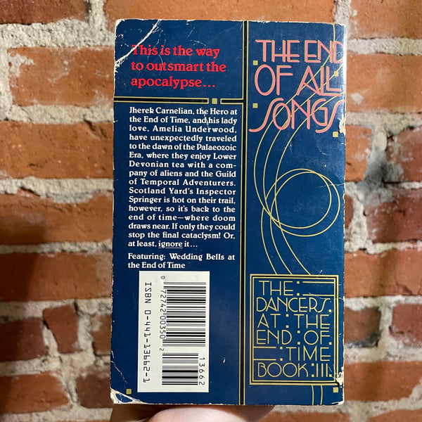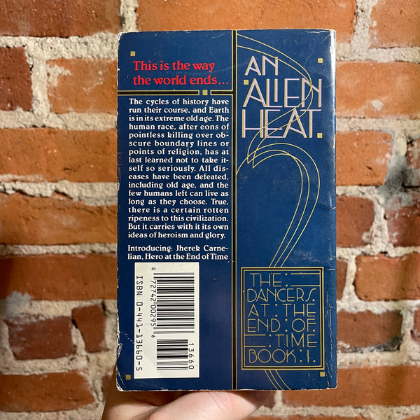 The Dancers at the End of Time, containing the novels An Alien Heat, The Hollow Lands and The End of All Songs, is a brilliant homage to the 1890s of Wilde, Beardsley and the fin de siècle decadents, satire at its sharpest and most colourful.”