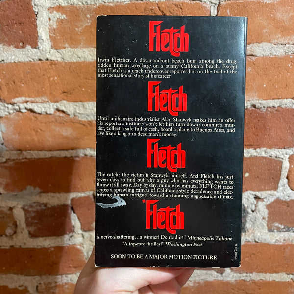 Fletch is an investigative reporter whose methods are a little unorthodox. Currently he’s living on the beach with the strung-out trying to find to the source of the drugs they live for. He’s taking more than a little flack from his editor. She doesn’t appreciate his style. Or the expense account items he’s racking up. Or his definition of the word deadline. Or the divorce lawyers who keep showing up at the office. So when multimillionaire Alan Stanwyk offers Fletch the job of a lifetime, which could be worth a fortune, he’s intrigued and decides to do a little investigation. What he discovers is that the proposition is anything but what it seems.”