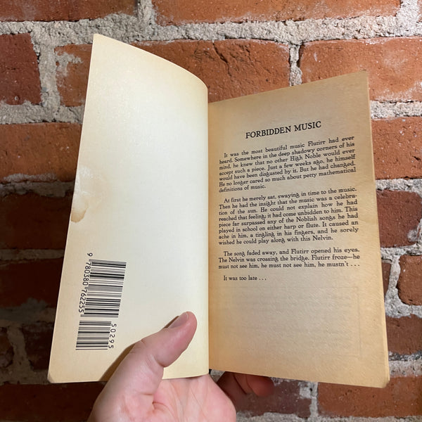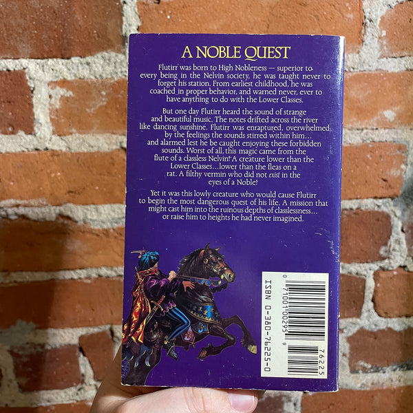 But one day Flutirr heard the sound of strange and beautiful music. The notes drifted across the river like dancing sunshine. Flutirr was enraptured, overwhelmed by the feelings the sounds stirred within him... and alarmed lest he be caught enjoying these forbidden sounds. Worst of all, this magic came from the flute of a classless Nelvin! A creature lower than the Lower Classes... lower than the fleas on a rat. A filthy vermin who did not exist in the eyes of a Noble!