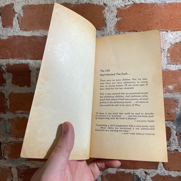 Blurb: “Since the 'Accident', when nuclear weapons were exploded in orbit, mankind has been sterile and no children have been born. Civilization has crumbled. In scattered enclaves, the old live as best they can while nature overwhelms the cities and roads. Algy Timberlane - Greybeard - and his wife, Martha, embark on a boat trip down the Thames to the sea, journeying through the strange new landscape, encountering extraordinary communities and people, in search of hope...”