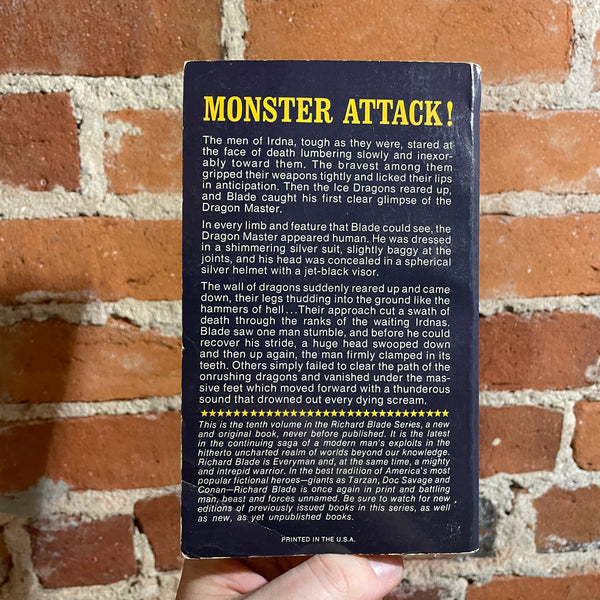 This is the tenth volume in the Richard Blade Series, a new and original book, never before published. It is the latest in the continuing saga of a modern man's exploits in the hitherto uncharted realm of worlds beyond our knowledge.