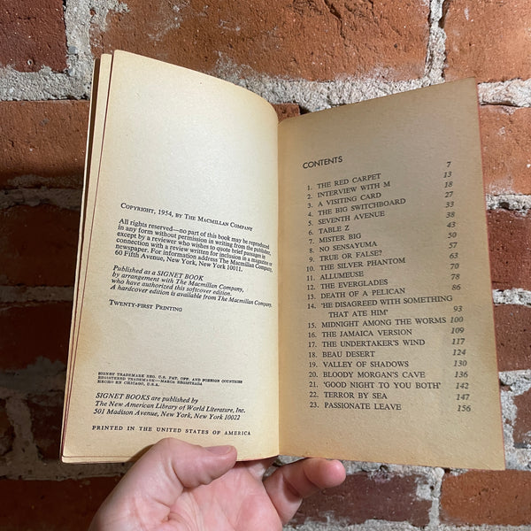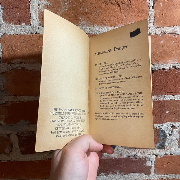 Blurb: “BOND SETS OUT TO "'LIQUIDATE" ONE MR. BIG, WHOSE BIZARRE ASSETS HAVE BEEN FINANCING SOVIET ESPIONAGE IN AMERICA...