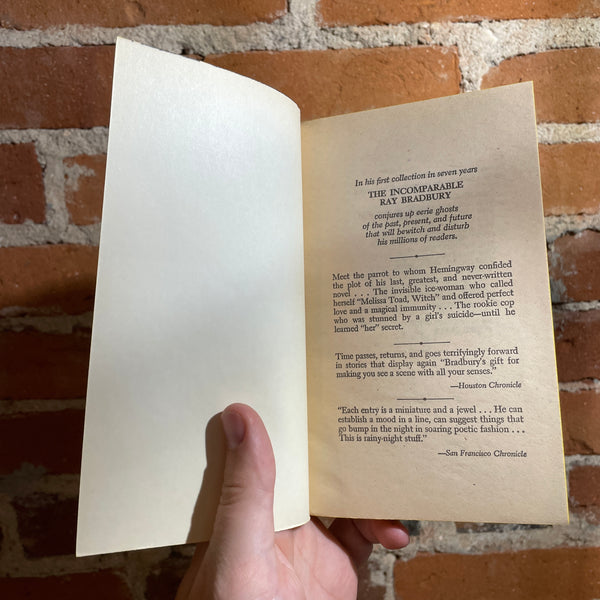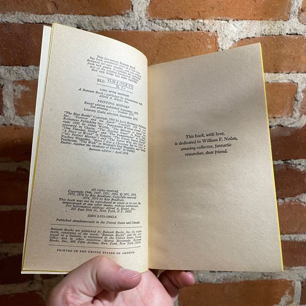 Blurb: “In these fantastical, chilling, hauntingly nostalgic tales you enter the master storyteller's special world where...A man can destroy the future by coming out of the past. Two drifters in space search through the dead cities of Mars for the fabled Blue Bottle. A young boy falls in love with a beautiful teacher who can't wait for him to grow up.