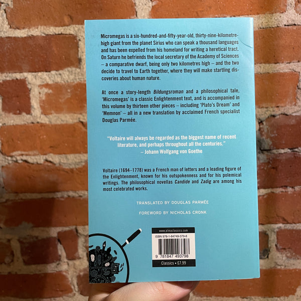 Blurb: "Micromegas is a six-hundred-and-fifty-year-old, thirty-nine-kilometre-high giant from the planet Sirius who can speak a thousand languages and has been expelled from his homeland for writing a heretical tract.