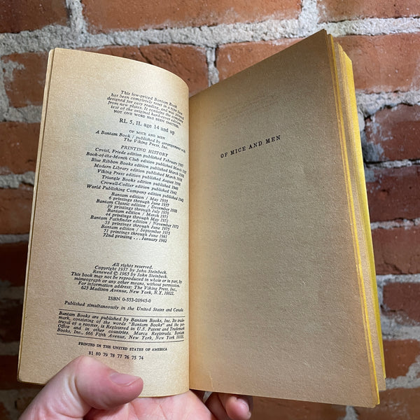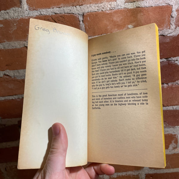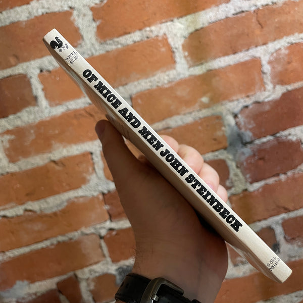 Blurb: Of Mice and Men- Clinging to each other in their loneliness and alienation, George and his simple-minded friend Lennie dream, as drifters will, of a place to call their own. But after they come to work on a ranch in Salinas Valley, their hopes. like "the best laid plans o'mice an men", begin to go awry.