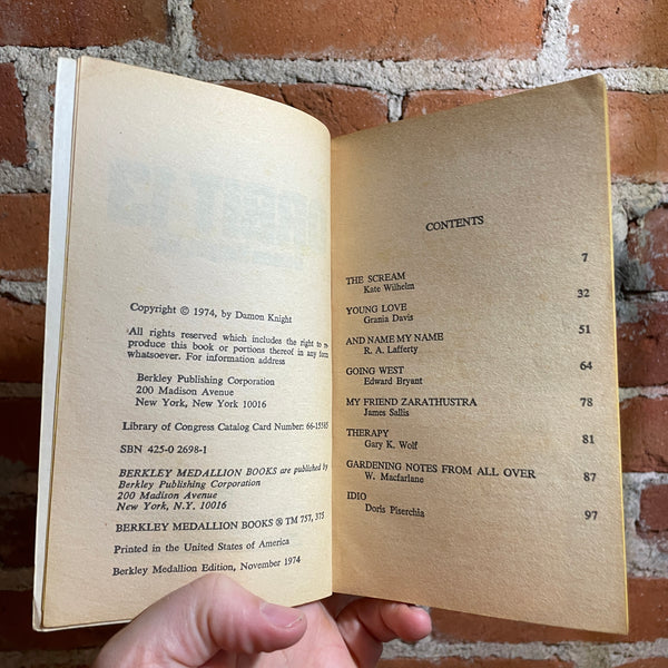 New stories by Gardner Dozois, Kate Wilhelm, R. A. Lafferty, Edward Bryant, Sonya Dorman and 15 more, including two of the most gifted new writers in the field today-Grace Rooney and William F. Orr.”