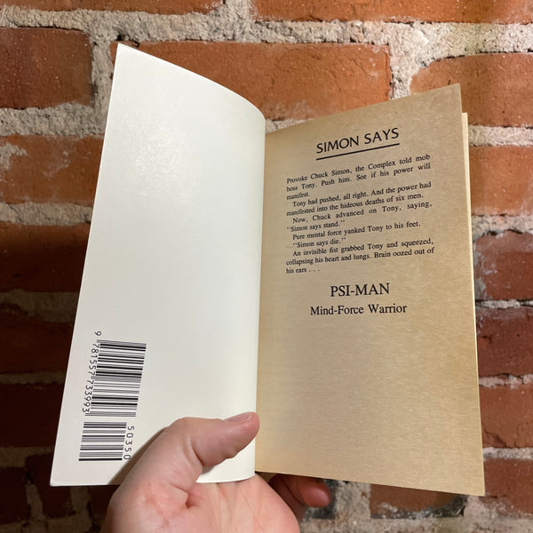 Blurb: “PSI: PSYCHIC POWERS SUCH AS TELEPATHY, TELEKINESIS AND CLAIRVOYANCE. TOMORROW'S ULTIMATE WEAPON. WHOEVER CONTROLS THE MIND-FORCE WILL RULE THE WORLD...
