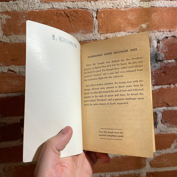 Kit's fellow-draftee Arkalion, the young man with the strange, old-man eyes, seemed to know more than he should. So when Kit twisted the tail of fate and followed Arkalion to the ends of space and time, he found the secret behind "Nowhere" and a personal challenge upon which the entire future of Earth depended.”