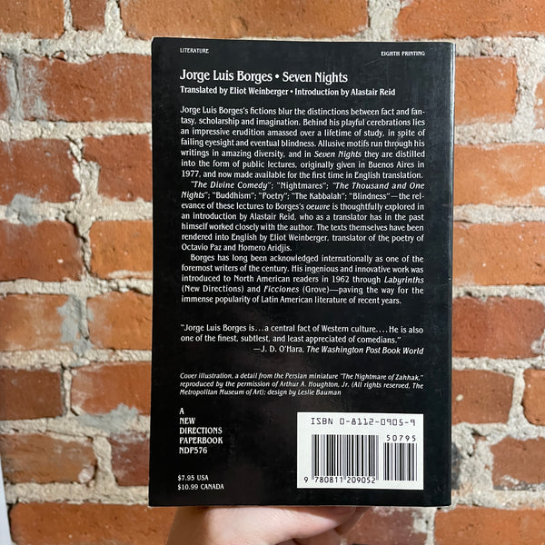Blurb: “Jorge Luis Borges's fictions blur the distinctions between fact and fan-tasy, scholarship and imagination. Behind his playful cerebrations lies an impressive erudition amassed over a lifetime of study, in spite of failing eyesight and eventual blindness. Allusive motifs run through his writings in amazing diversity, and in Seven Nights they are distilled into the form of public lectures, originally given in Buenos Aires in 1977, and now made available for the first time in English translation.