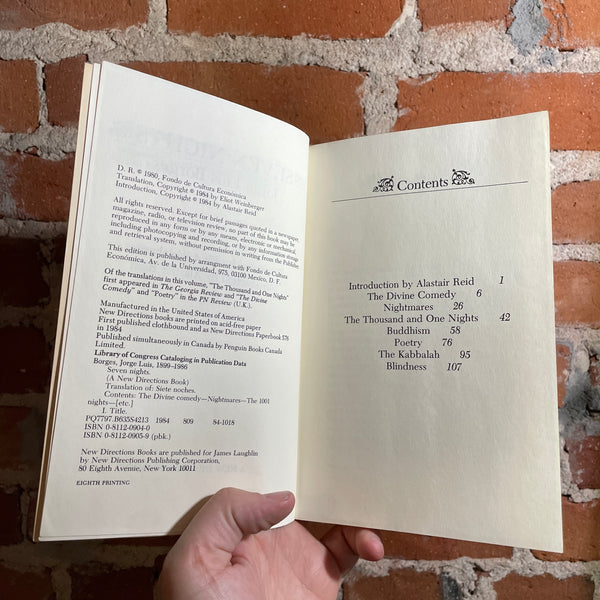 "The Divine Comedy": "Nightmares"; "The Thousand and One Nights; "Buddhism"; "Poetry"; "The Kabbalah"; "Blindness" — the relevance of these lectures to Borges's oeuvre is thoughtfully explored in an introduction by Alastair Reid, who as a translator has in the past himself worked closely with the author. The texts themselves have been rendered into English by Eliot Weinberger, translator of the poetry of Octavio Paz and Homero Aridjis.