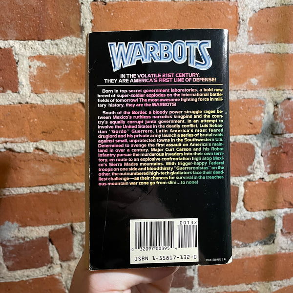 Determined to avenge the first assault on America's main• land in over a century, Major Curt Carson and his Robot Infantry pursue the murderous invaders into their own terri-tory, en route to an explosive confrontation high atop Mexico's Sierra Madre mountains. With trigger-happy Federal troops on one side and bloodthirsty "Guerreronistas" on the other, the outnumbered high tech gladiators face their deadliest challenge-as their chances for survival in the treacherous mountain war zone go from slim... ta none!”
