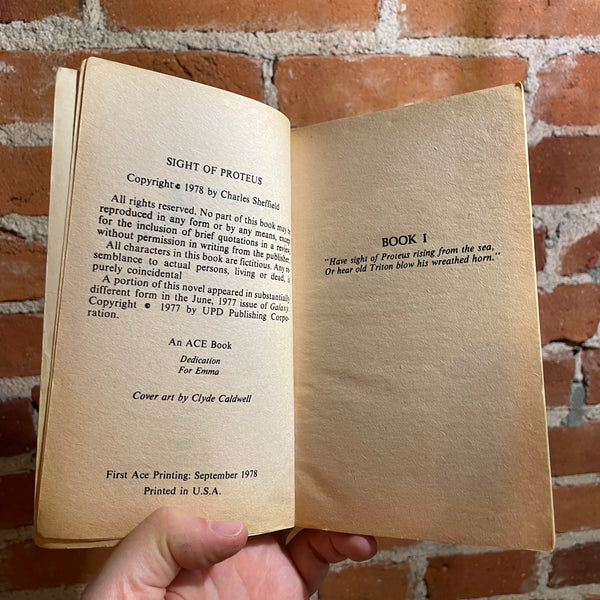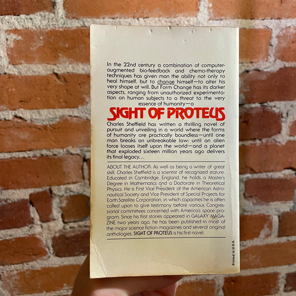 ABOUT THE AUTHOR: As well as being a writer of great skill, Charles Sheffield is a scientist of recognized stature Educated in Cambridge, England, he holds a Master's Degree in Mathematics and a Doctorate in Theoretical Physics. He is First Vice President of the American Astronautical Society and Vice President of Special Projects for Earth Satellite Corporation, in which capacities he is often called upon to give testimony before various Congressional committees concerned with Americas space pro-gram. Since his first stories appeared in GALAXY MAGAZINE two years ago, he has been published in most of the major science fiction magazines and several original anthologies. SIGHT OF PROTEUS is his first novel.”