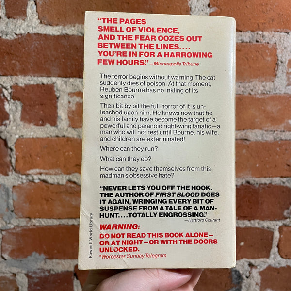 THE AUTHOR OF FIRST BLOOD DOES IT AGAIN, WRINGING EVERY BIT OF SUSPENSE FROM A TALE OF A MAN-HUNT... TOTALLY ENGROSSING"' -Hartford Courant