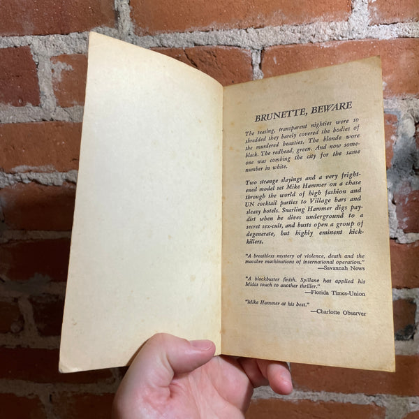 Blurb: “MIKE HAMMER smashes into an underground orgy cult — an international Who's Who of Very Important Perverts who throw sadistic bashes, buy beauties like Greta (a money-lusting brunette model who performs best in a sexy negligee), and wind up their vicious fun with morning-after murder...
