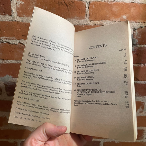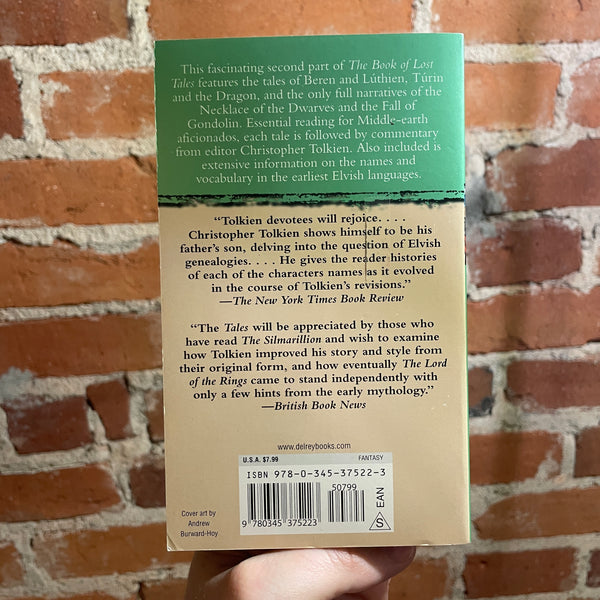 Blurb: The Book of Lost Tales 2 (The History of Middle-Earth, Vol. 2) "The Book of Lost Tales was the first major work of imagination by J.R.R. Tolkien, begun in 1916, when he was twenty-five years old, and left incomplete several years later. It stands at the beginning of the entire conception of Middle-earth and Valinor, for the Lost Tales were the first form of the myths and legends that came to be called The Silmarillion. Embedded in English legend and association, they are set in the narrative frame of the great westward voyage of a mariner named Eriel (or AElfwine). His destination is Tol Eressea, the Lonely Isle where Elves dwell; from them he learns their true history, the Lost Tales of Elfinesse. The Tales include the earliest accounts of Gods and Elves, Dwarves, Balrogs, and Orcs; of the Silmarils and the Two Trees of Valinor; of Nargothrond and Gondolin; of the geography and cosmography of their invented world. The Book of Lost Tales is published in two volumes. The first contains the Tales of Valinor; and this second past includes Beren and Luthien, Turin and the Dragon, and the only full narratives of the Necklace of the Dwarves and the Fall of Gondolin. Each tale is followed by a commentary, together with associated poems, and each volume contains extensive information on names and vocabulary of the earliest Elvish languages. Additional books in this series will extend the history of Middle-earth as it was refined and enlarged in later years and will include the long Lays of Beleriand, the Ambarkanta or Shape of the World, the Lhammas or Account of Tongues, annals, maps, and many other previously unpublished writings of J.R.R. Tolkien."Keywords: FANTASY SCIENCE FICTION HISTORY MIDDLE EARTH JRR TOLKIEN BOOK OF LOST TALES