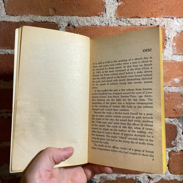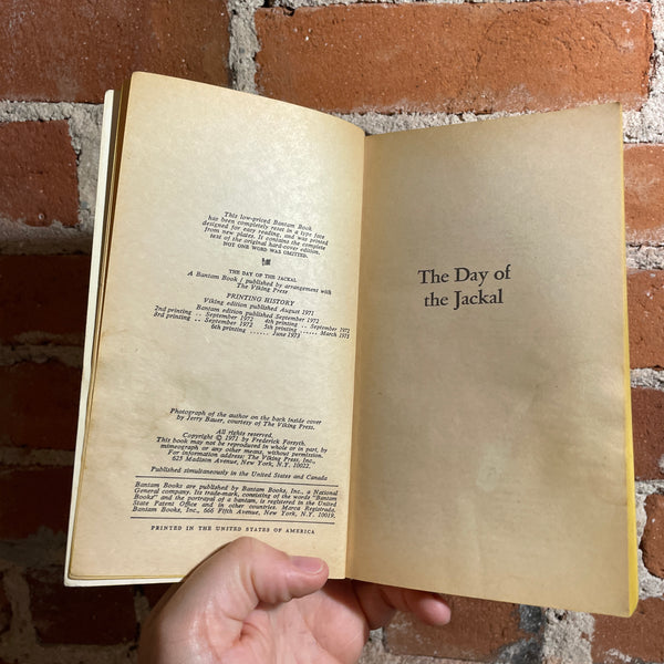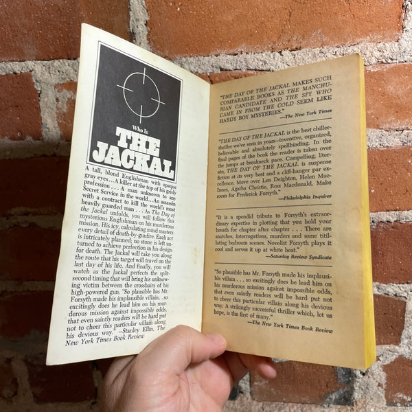 Secret Service in the world...An assassin with a contract to kill the world's most heavily guarded man... As The Day of the Jackal unfolds, you will follow this mysterious Englishman on his murderous mission. His icy, calculating mind masters every detail of death-by-gunfire. Each act is intricately planned; no stone is left unturned to achieve perfection in his design for death. The Jackal will take you along the route that his target will travel on the last day of his life. And finally, you will watch as the Jackal perfects the split-second timing that will bring his unknowing victim between the crosshairs of his high-powered gun. "So plausible has Mr.