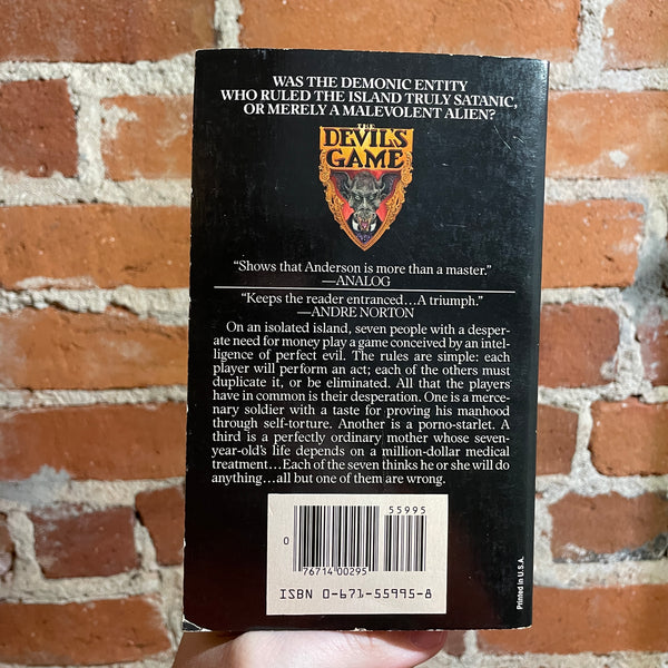 On an isolated island, seven people with a desperate need for money play a game conceived by an intelligence of perfect evil. The rules are simple: each player will perform an act; each of the others must duplicate it, or be eliminated. All that the players® have in common is their desperation. One is a mercenary soldier with a taste for proving his manhood through self-torture. Another is a porno-starlet. A third is a perfectly ordinary mother whose seven-year-old's life depends on a million-dollar medical treatment... Each of the seven thinks he or she will do anything...all but one of them are wrong.”