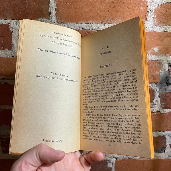 Blurb: “THOMAS BURNETT SWANN.. is an altogether unique writer in the world of fantasy and science fiction, for he alone has taken for his province that part of the unrecorded past which some call myth and others call memories of prehistory. Here in THE FOREST OF FOREVER dwells the last Minotaur, and here too are the other lingering dwellers in that folk-whispered country where dwell the beasts that are human and the humans that are beasts. ...”