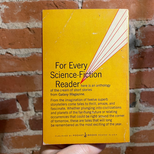Blurb: “From the imagination of twelve superb storytellers come tales to thrill, amaze, and fascinate. Whether plunging into civilizations and planets of the far-flung future or relating occurrences that could be right around the corner of tomorrow, these are tales that will long be remembered as the most exciting of the year.”