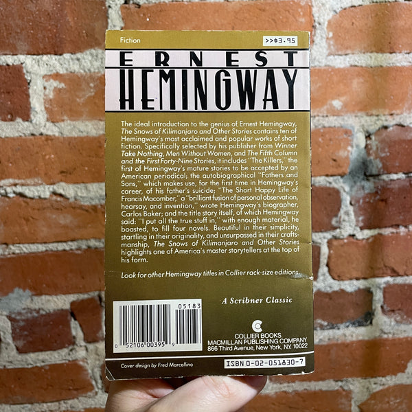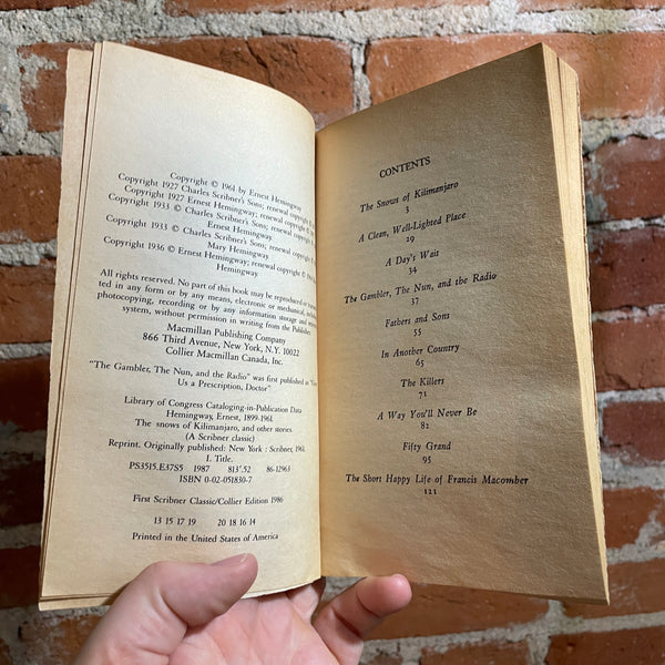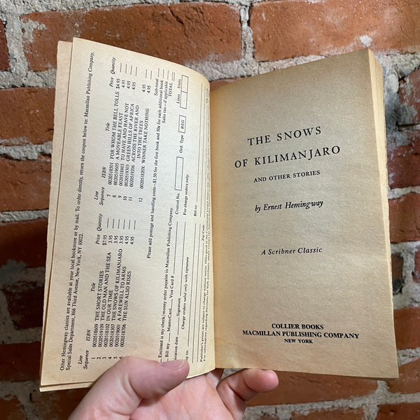 Blurb: “The ideal introduction to the genius of Ernest Hemingway, The Snows of Kilimanjaro and Other Stories contains ten of Hemingways most acclaimed and popular works of short fiction. Specifically selected by his publisher from Winner Take Nothing, Men Without Women, and The Fifth Column and the First Forty-Nine Stories, it includes "The Killers," the first of Hemingway's mature stories to be accepted by an American periodical; the autobiographical "Fathers and Sons, "which makes use, for the first time in Hemingway s career, of his father's suicide, "The Short Happy Life of Francis Macomber," a "brilliant fusion of personal observation, hearsay, and invention," wrote Hemingway's biographer, Carlos Baker; and the title story itself, of which Hemingway said: "I put all the true stuff in, "with enough material, he boasted, to fill four novels. Beautiful in their simplicity, startling in their originality, and unsurpassed in their crafts-manship, The Snows of Kilimanjaro and Other Stories highlights one of America's master storytellers at the top of his form.”
