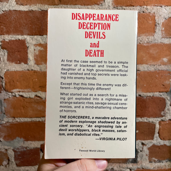 THE SORCERERS, a macabre adventure of modern espionage shadowed by ancient sorcery. "An engrossing tale of devil worshippers, black masses, satan-ism, and diabolical rites." -VIRGINIA PILOT”