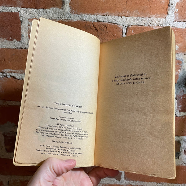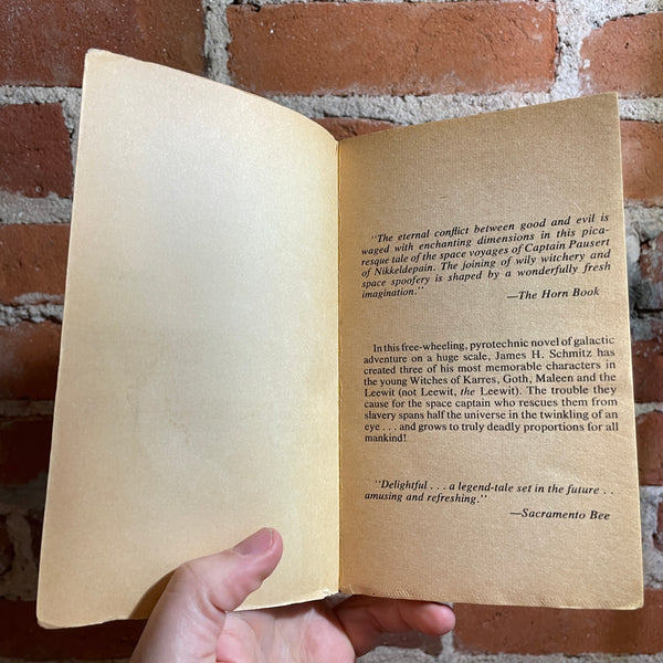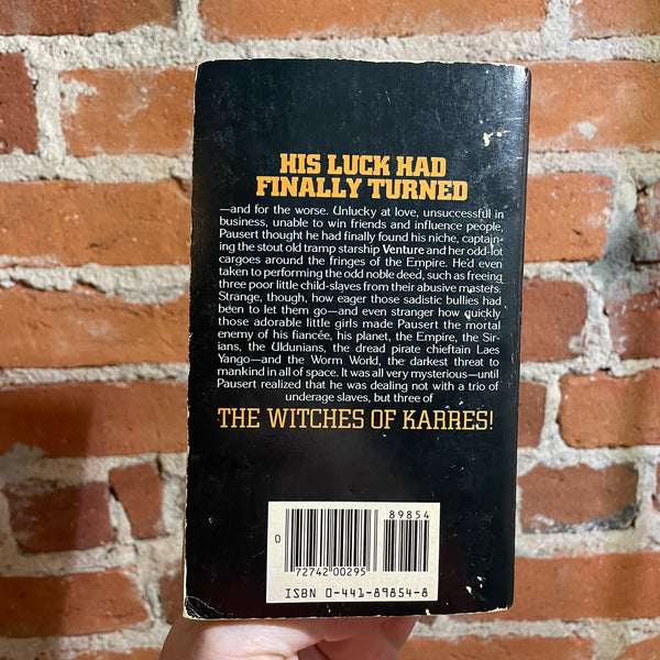 "In the far future, Mankind has scattered among the stars, bred into peculiar forms and developed peculiar powers. Captain Pausert of Nikkeldepain makes the serious mistake of rescuing three little Witches of Karres from their overwrought owners. There fol low espionage, piracy, assorted forms of mayhem, and a freewheeling galactic war that nobody knew was in progress. You will, in the process, encounter such things as Worm Weather, klatha hooks, and a vatch to end all vatches... not to mention grik dogs and Nartheby Sprites and Sheem Robots.' -P. Schuyler Miller, Analog”