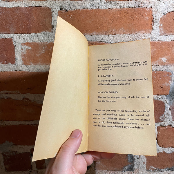 Blurb: “HERE IS ANOTHER COLLECTION OF NEVER-BEFORE-PUB-LISHED SCIENCE FICTION STORIES WRITTEN ESPECIALLY FOR THIS VOLUME. THIRTEEN GREAT STORIES OF THE IMAGINATION BY THE OLD MASTERS AND THE NEW-COMERS, INCLUDING: