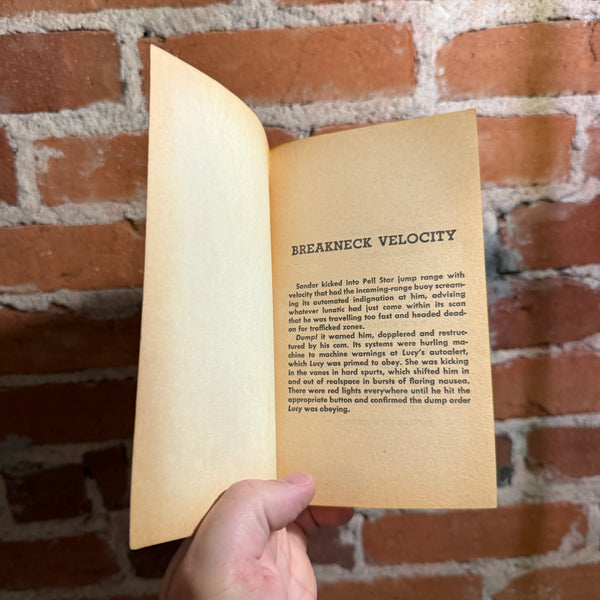 Publisher blurb: "His name was Sandor and he was the owner and entire crew of a tramp star-freighter that flew the Union planets under false papers and fake names. Her name was Allison and she was a proud but junior member of the powerful family whose mighty starship, Dublin Again, was the true queen of the spaceways. They met at Viking Station, she seeking a night’s dalliance, he desperately in search of a spacer assistant. Their fateful meeting was to lead to a record-breaking race to Pell Station, thereby catching the calculating eye of the grim commander of the Alliance battlecraft Norway, and a terrifying showdown at a deadly destination off the cosmic charts."