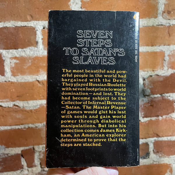 Blurb: “The most beautiful and powerful people in the world had bargained with the Devil. They play Russian Roulette with seven footprints to world domination--and lost. They had become subject to the Collector of Infernal Revenue--Satan. The Master Player of games would glut his lust with souls and gain world power through diabolical manipulations. But into his collection comes James Kirkham, an American explorer determined to prove that the steps are stacked.”