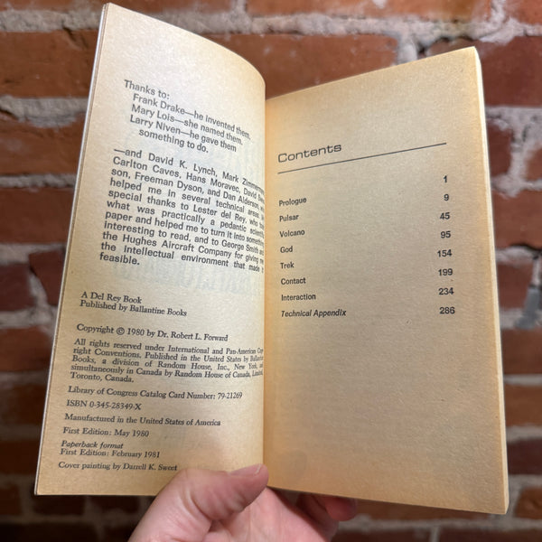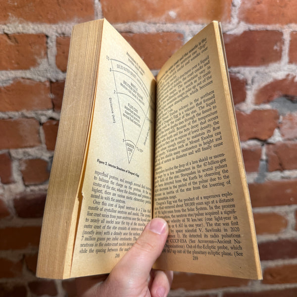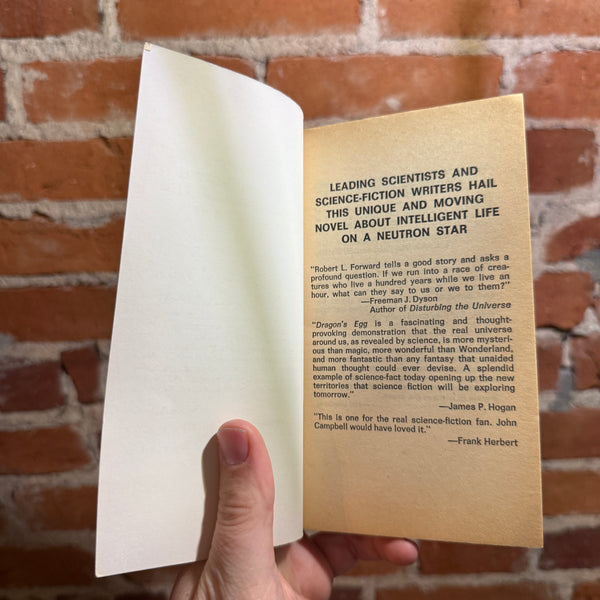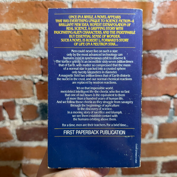 Publisher blurb: "In a moving story of sacrifice and triumph, human scientists establish a relationship with intelligent lifeforms--the cheela--living on Dragon's Egg, a neutron star where one Earth hour is equivalent to hundreds of their years. The cheela culturally evolve from savagery to the discovery of science, and for a brief time, men are their diligent teachers . . ."