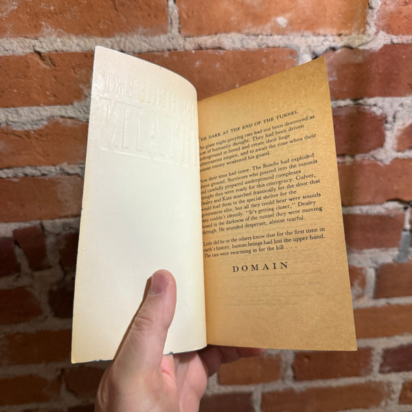 Three survivors, Steve Culver, Alex Dealey, and a young woman called Kate, cling together and explore the vast subterranean tun-nel, only to discover it swarming with bloodthirsty rats that thrive on radiation-that breed, evolve, grow stronger and more intelligent each day, and wait for the chance to wipe out their human enemy. The survivors are in terror. And as they desperately seek exit from the darkness, they get a haunting look into the future where man may have to battle beast for ultimate supremacy....”