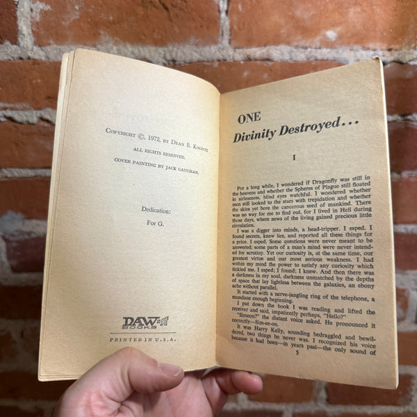 The encounter of Simeon Kelly inside the soul? mind? cosmos? of this final gene-construct is a novel which spans the crises of the present with the whole ultimate mystery of Creation itself -- possibly the most serious novel ever written by the rapidly rising SF talent of Dean R. Koontz.