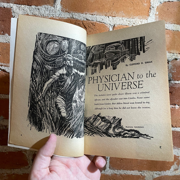 Blurb: “Features a PHYSICIAN TO THE UNIVERSE -a novelet by Clifford Simak