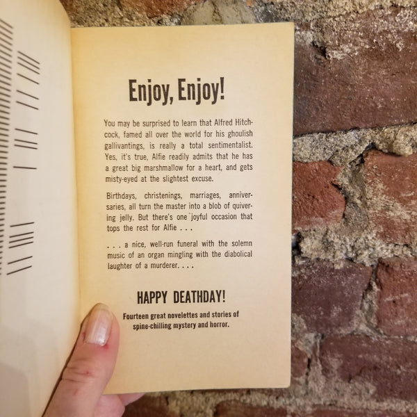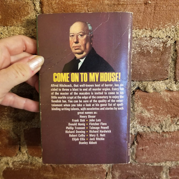 Alfred Hitchcock, that well-known host of horror, has decided to throw a blast to end all murder orgies. Every fan of the master of the macabre is invited to come to his little marble crypt at the edge of the cemetery to enjoy the fiendish fun. You can be sure of the quality of the entertainment when you take a look at his guest list of spell-binding writing talents, with novelettes and stories by such great names as: Fletcher Flora, Talmage Powell, Mary E. Nutt, Richard Deming, Jack Ritchie, John Lutz, Robert Colby, Donald Honig, Richard Hardwick, Stanley Abbott, Frank Sisk, Henry Slesar, Elijah Ellis & Phillip Tremont.