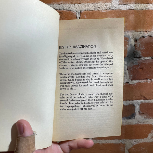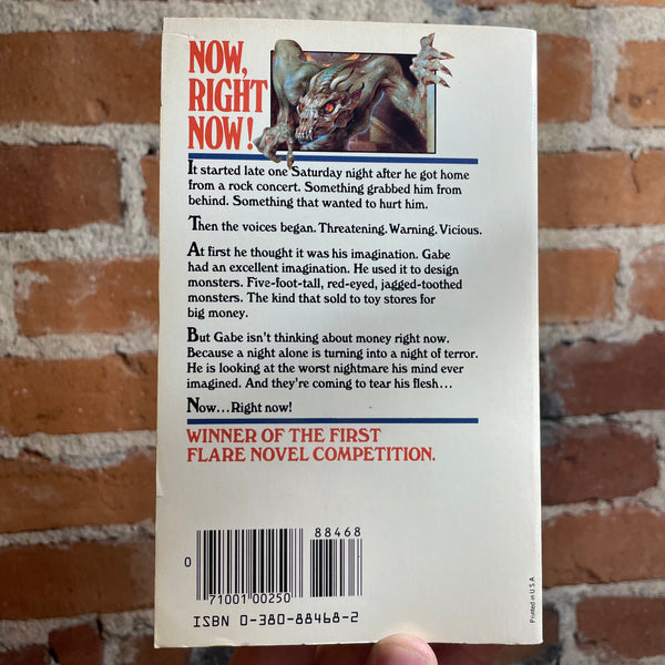 Blurb: "It started late one saturday night after he got home from a rock concert. Something grabbed him from behind. Something wanted to hurt him. Then the voices began. Threatening. Warning. Vicious. At first he thought it was his imagination. Gabe had an excellent imagination. He used it to design monsters. Five-foot-tall, red eyed, jagged toothed monsters. The kind that sold to toy stores for big money. But Gabe isn't thinking about money right now. Because a night alone is turning into a night of terror. He is looking at the worst nightmare his mind ever imagined. And they're coming to tear his flesh...Now...Right now!"-Lee J. Hindle”
