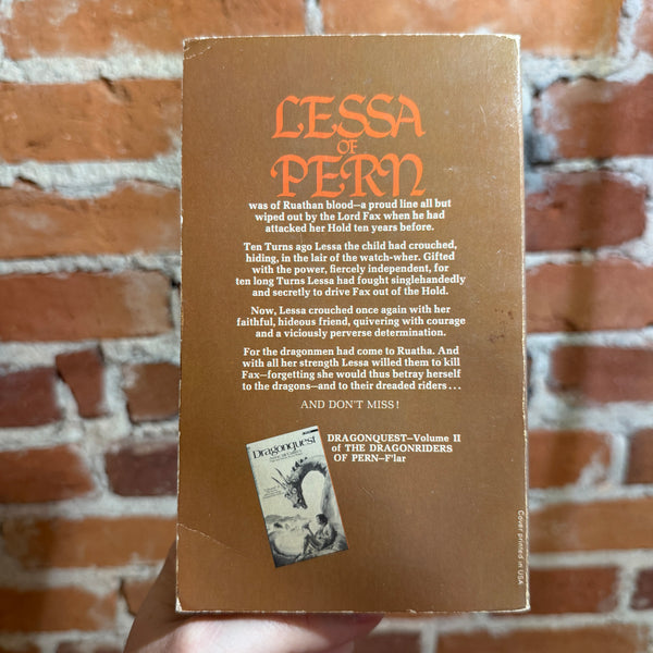 Ten Turns ago Lessa the child had crouched, hiding, in the lair of the watch-wher. Gifted with the power, fiercely independent, for ten long Turns Lessa had fought singlehandedly and secretly to drive Fax out of the Hold.