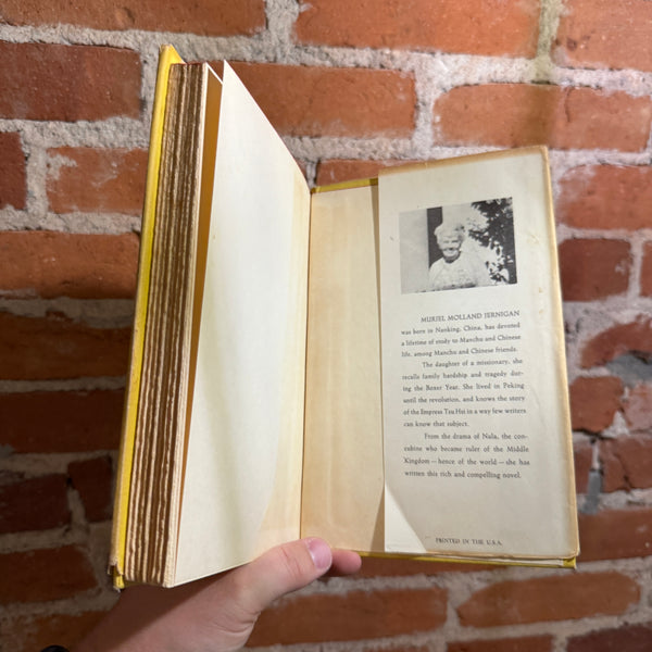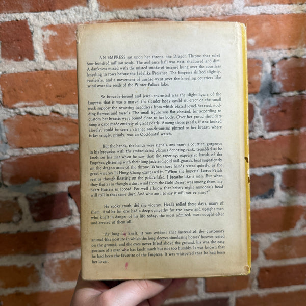 So brocade-bound and jewel-encrusted was the slight figure of the Empress that it was a marvel the slender body could sit erect or the small neck support the towering headdress from which blazed jewel-hearted, nodding flowers and tassels. The small figure was flat-chested, for according to custom her breasts were bound close to her body. Over her proud shoulders hung a cape made entirely of great pearls. Among those pearls, if one looked closely, could be seen a strange anachronism: pinned to her breast, where it lay snugly, primly, was an Occidental watch.